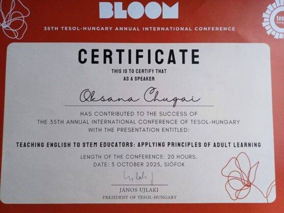 Oksana Chugai, an associate professor at the National Technical University of Ukraine “Igor Sikorsky Kyiv Polytechnic Institute,” shared the results of her research in the presentation “Teaching English to STEM Educators Applying Principles of Adult Learning.” This study examines Ukrainian STEM educators’ experiences in English courses, focusing on their language proficiency, professional growth, confidence, and use of technology. It highlights challenges faced, coping strategies, and emphasizes the importance of integrating English training into professional development, aligning with adult learning principles for effective outcomes.