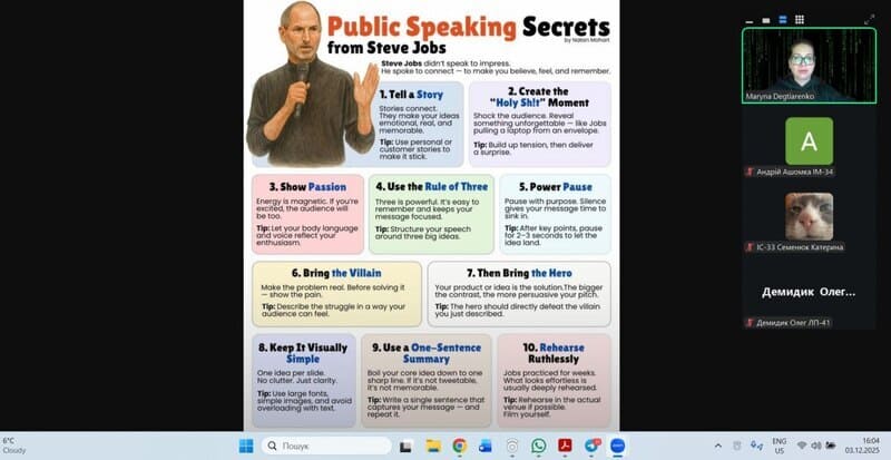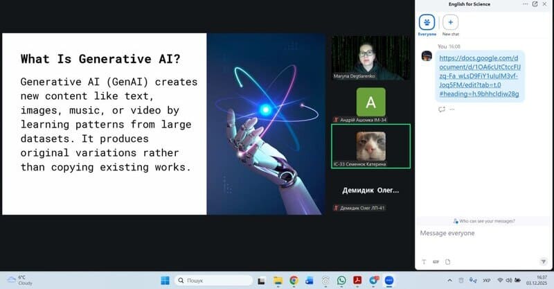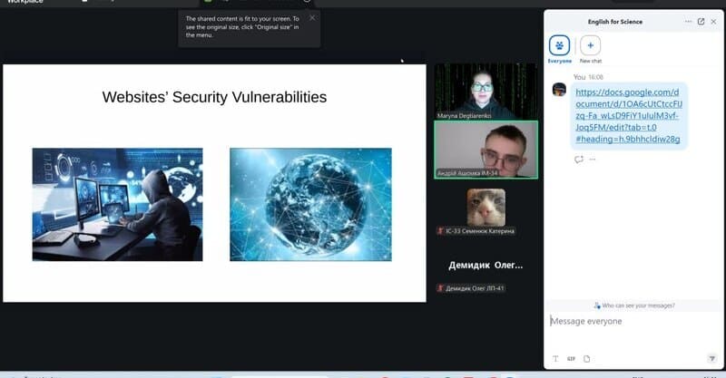 This session was dedicated to students’ presentations, allowing them to demonstrate the skills they had learned and practiced throughout the semester. The participants illustrated their understanding of these techniques through well-organized, engaging, and confident presentations of their individual projects. During the meeting, students presented their individual topics, including “Websites’ Security Vulnerabilities”, “The Art of Imitation: How Generative AI Creates Text, Art, and Music”, and “Paper as a Material for Learning and Technical Projects”.